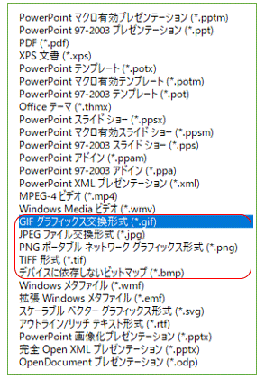 「ファイル」~「名前を付けて保存」で、任意の場所を決めると「名前を付けて保存」画面が出ます。「ファイルの種類」で右図のような拡張子一覧から画像で使う