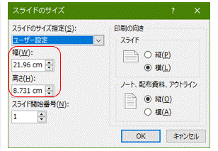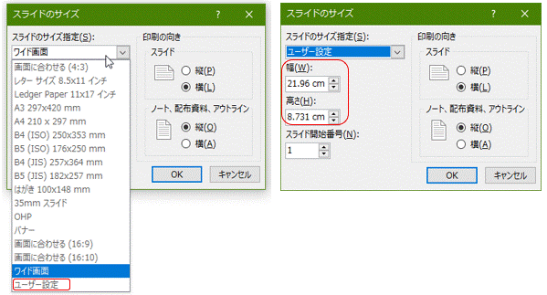 ここで「830×330」ピクセルのスライドを作ります。「デザイン」タブ ~「ユーザー設定」~「スライドのサイズ」~「ユーザー設定のスライドのサイズ」を選択します。下図左が現れるので「スライドのサイズ指定」で、最下段の「ユーザー設定」を選択します。