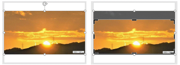 ② 写真を選択し「書式」タブ ~「トリミング▼」~「トリミング」から、「830×330」の縦横比を頭に描いて(概略でよい)、上下を(必要なら左右も)トリミングします。(下図右)