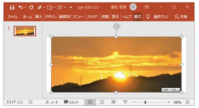 ④ 先に作っておいた「ppt-830×330.pptx」を起動して、スライドに③で仮保存しておいた写真を貼り付けます。(下図)