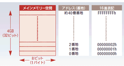 さて、CPU がプログラムやデータにアクセス可能なメモリの大きさは、メモリ空間と呼ばれます。このメモリ空間 には、1バイト(8ビット)ごとにアドレス(番地)が振られており、OS