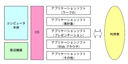 実際にコンピュータが働くためには、ハードウェアとソフトウェア(プログラム)の連携が必要です。このハードとソフトの関係を概念的にまとめると、下図 のようになります。