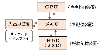 右図はPCの構成をイメージしたコンピュータの基本構成図です。コンピュータが働くとは CPUとメモリとの間のプログラムとその処理結果のやり取り