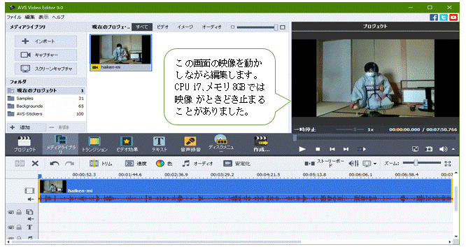 i7、メモリは8GBのPCです。動画編集ソフトは下図のような「AVS Video Editor」というごく普通のソフトを使っています。映像の不要部分を削除したりしていると、ときどき映像がピタッと止まることがあります。そんなときは編集ソフトを再起動して、残りの部分の編集を続けるようにしてきました。メモリ容量が少し足りないようです。