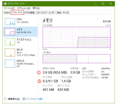 ②-① =4.3GB-3.9GB =0.4GB が仮想メモリとして働いていることが分かります。