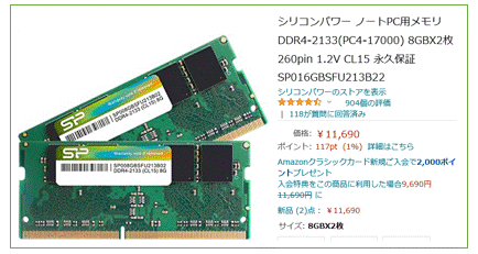 さて、メモリには多くの種類や規格があります。私がAmazonで買った下図の16GBの例で説明します。