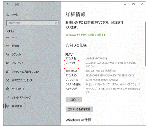 (「バージョン情報」となっていることもある)をクリック 、 右列「プロセッサ」と「実装RAM」(下図赤枠)の内容を見てください。プロセッサ・実装RAMは、通称は CPU ・メモリと呼びます。
