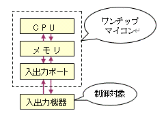 一般のコンピュータでも、入力装置・出力装置で汎用化できる部分を入出力ポートとしてIC化していますが、マイコンではこの部分を意識的に表に出しています。また、入出力はキーボードやディスプレイでなく、温度を検知してモータの回転速度を変えるなど、制御イメージを出すため入出力機器という表現を使いました。