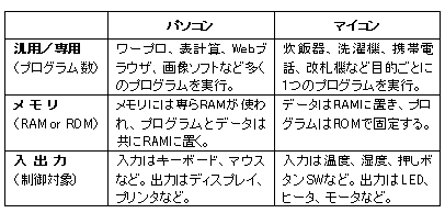 パソコンとマイコンは原理的には同じであるとしても、このように物理的イメージは両者で全く異なります。使用実態と構成面からの主な相違点を下表にまとめます。
