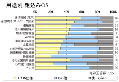 パソコンのように、「速い方がよい」だけでは済まされません。このようなシステムをリアルタイムシステムといい、この目的のためのOSをリアルタイムOSといいます。少し古いデータですが、リアルタイムOSの使用状況のデータがあります。