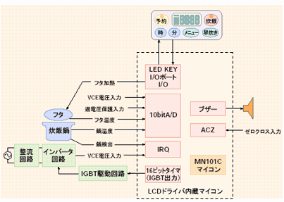 マイコンの炊飯器への応用例を下図に示します。ここで、「LCDドライバ内蔵マイコン」とあるのは、MN101Cの機能に周辺機器も含めてワンチップにした炊飯器専用マイコンを意味しています。また、A/Dは温度などのアナログ量をデジタル量に変換するA/D変換器、IRQは外部機器からの割り込み入力、LCD(Liquid