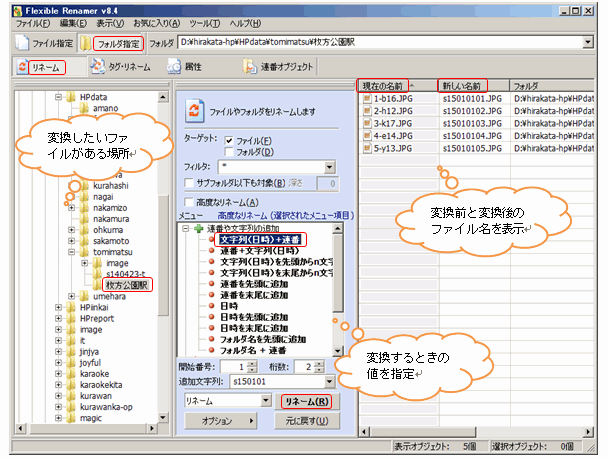 上図は 私のパソコンにある5個の写真を、Flexible Renamerを使ってリネームする過程を示しています。以下にリネームの実際の手順を記します。