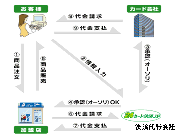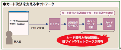 利用者がショップのサイトにカード番号を打ち込むと、ショップはそのカード番号を直接カード会社に送るのではなく、ネットワーク会社や決済代行サービス会社を経由して、カード会社に送ります。