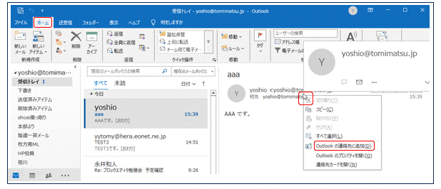 下図はOutlookを「ホーム」タブで開いているときの図で、左欄・中央欄・右欄から成っています。アドレス帳を作る簡単な方法は、左欄で「受信トレイ」を選択、中央欄で受信したメールを選択し、右欄でその差出人アドレスを右クリックして現れるメニューから、「Outlookの連絡先に追加」をクリックします。