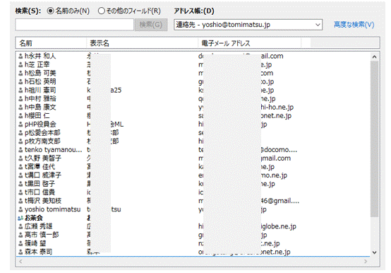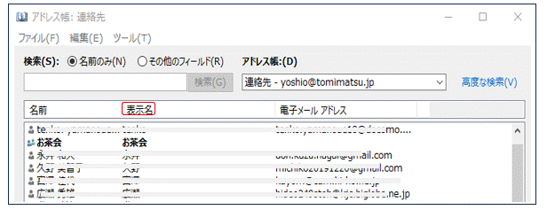 なお、下図アドレス帳で個別の内容を変更したいときは、その行をダブルクリック(右クリック~プロパティでも可)すると、次項の「連絡先」の図が現れるので修正できます。