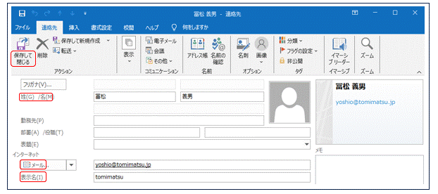 この画面に「姓名・表示名・メール」の3つを記述します。この操作で前項のアドレス帳の「名前・表示名・電子メールアドレス」に反映されます。連絡先にはこの3点以外は記入しない方が分かりやすいです。