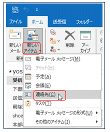 紙などでもらったメールアドレスをアドレス帳に追記するには、まず個々の「連絡先」に入力して アドレス帳に反映させます。右図でOutlookの「ホーム」ダブの「新しいアイテム」~「連絡先」をクリックすると、下図で何も記述のない白紙の画面が現れます。