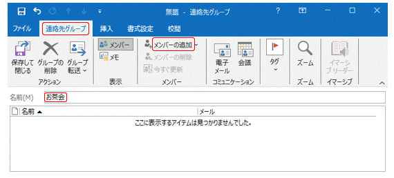3.下図の「連絡先グループ」タブで、まずグループの名前「お茶会」を入力します。