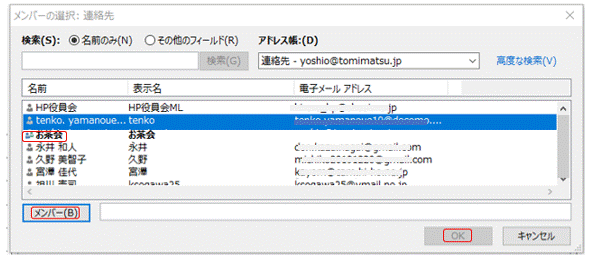 5.下図「アドレス帳」で Ctrl キーを押しながら、お茶会のメンバーを順次選択して、