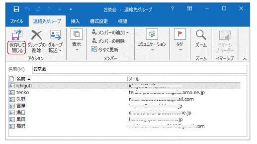 6. 下図のように「連絡先グループ」タブに戻って、左上の「保存して閉じる」を押して連絡先のグループ化を終了します。