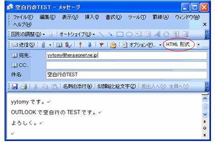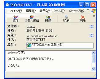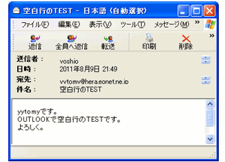 ただ、このOutlook で送られて来たメールを、受信側のメールソフトで「テキスト形式」で読み取るように設定してある場合には、メールを受信すると「一行おきに空白行」となって表示されることになります。