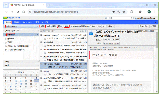 eoWEBメールに話を戻します。下図は eoWEBメールのトップ画面で「
