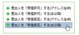 受信したメールを「受信拒否」指定すると「受信拒否リスト」に登録されて、そのアドレスのメールは以降の受信から「ゴミ箱」に直行することになります。こんなメールの処理ルールを一般に「フィルタ」と呼び、これに「フィルタ名」を付けて管理します。上図のトップにある「受信拒否リスト」の文字がフィルタ名です。
