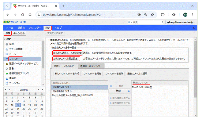 ここで上図右欄の「有効なフィルタ」枠に「かんたんメール設定」の表示が出ることを確認してください。