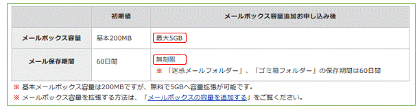 ちなみに、テキストメール 1通の容量は 10kBほどですから、ボックス容量 5GBの場合 50万通ほど保存できる計算になります。実質的なボックス容量は無限大ということです。