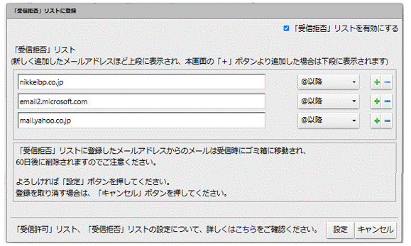 eoWEBメールでいう迷惑メールは、一般の IT業界でいう意味と同じです。上図右欄の「かんたん迷惑メール拒否設定」を開いて、「設定」ボタンをクリックすればその機能を開始します。なお、この「設定」操作は