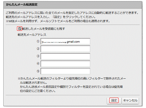 下図「かんたんメール転送設定」画面で、「転送したメールを受信箱に残す」に ✓して、転送先のスマホのメールアドレス(例えばGmail など)を「転送先メールアドレス」に指定します。右下の「設定」ボタンを押してメールの転送設定は完了です。