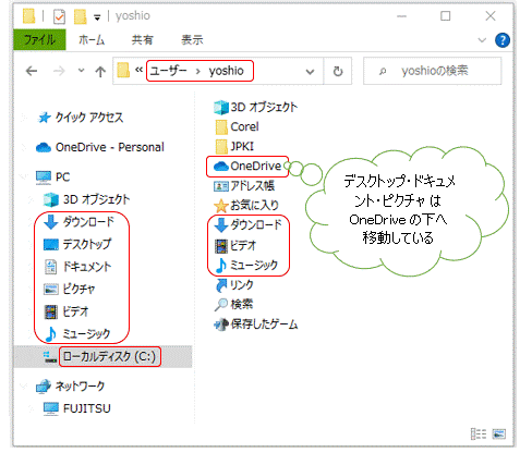 フォルダの自動バックアップ」という仕組みがあり、「個人ユーザー名」の下にある「ドキュメント」など 3つのフォルダを、下図のようにクラウドのOneDriveに移動することが多いのです。このことを頭において先に進みます。