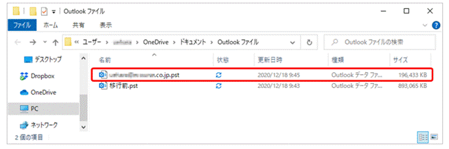ここでは Outlookのデータ「.pstファイル」が OneDriveの「ドキュメント」にあり、 そこから「C:ドライブ ~ ユーザー ~