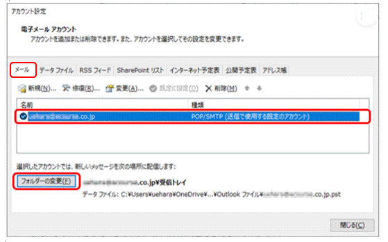 ここで再度 Outlookを開きます。下図「アカウント設定」画面で「メール」タブから、対象のアカウントを選択し「フォルダの変更」をクリックします。