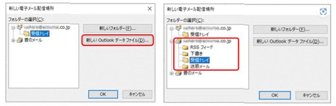 下図左画面が開くので「新しいOutlookデータファイル」をクリックします。下図右画面になり先ほどコピーした「.pstファイル」の配信場所が追加されました。「OK」ボタンを押します。