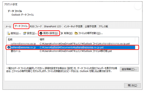 下図「アカウント設定」画面の「データファイル」タブをクリックし、「C:ドライブ ~ ユーザー ~ 個人ユーザー名」の下の「ドキュメント」の「.pstファイル」を「既定に設定」します。