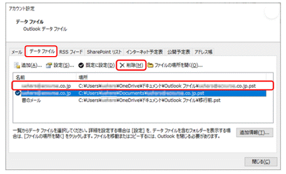 急ぐ必要はありませんが、OneDriveにある「旧.pstファイル」は削除してもいいでしょう。下図「データファイル」タブで、OneDriveの「.pstファイル」を選択して「削除」をクリックします。ただ、「削除」を選択してもメールデータは失われません。