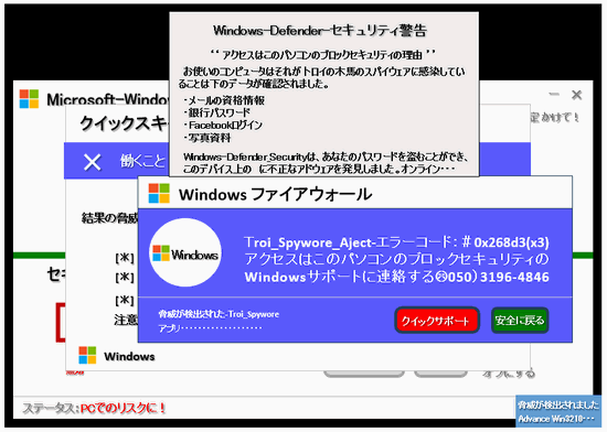 さて、ブラウザを操作中にある条件で突然表示される画面を「ポップアップ」といいます。この詐欺メッセージはこのポップアップの技術で作られているようです。ポップアップを大きな画面にして右上に「×」を付けると、それらしく見えますが画面を消すことはできません。ブラウザには本来ウイルスを検知する機能はなく、そこに警告が表示されること自体がおかしいです。これはウィルスではありません。