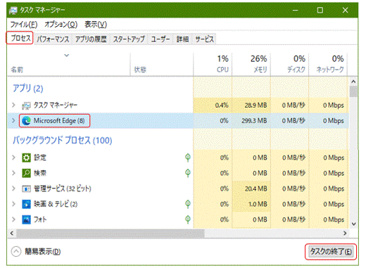 下図のように「タスクマネージャー」アプリが立ち上がります。「プロセス」タブで、詐欺メッセージを表示しているブラウザ(ここではMicrosoft Edge)を選択して、画面右下「タスクの終了」ボタンを押します。これでブラウザを閉じることができます。