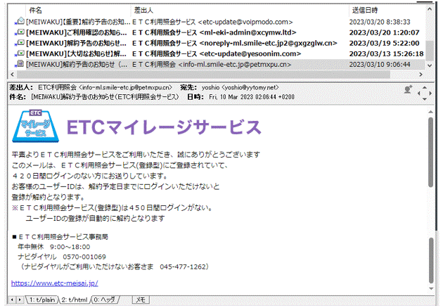 下図は高速道への「ETC」を装ったネット詐欺の一例です。「ETC利用サービスに420日間ログインがないので、間もなく自動的に解約されます」の主旨が読み取れます。下図で5通の差出人アドレスは