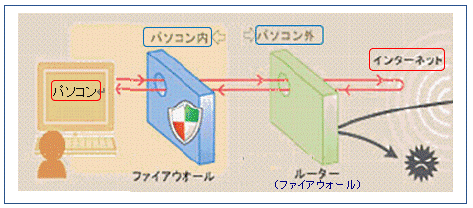 下図で「パソコン内」で「ファイアウォール」とあるのは、ウイルス対策ソフトが持つ機能のひとつで、PCへ突入してくる不正アクセスを未然に防ぎます。後に詳しく述べますが、ルーターはそのものがファイアウォールであり、ウイルス対策ソフトのファイアウォールと合わせて2重のファイアウォール構成になっています。