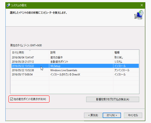 下図下方にある「他の復元ポイントを表示する」が表示されている場合は、ここにチェックを付けると過去の復元ポイントが追加表示されて、その復元ポイントを指定することもできます。
