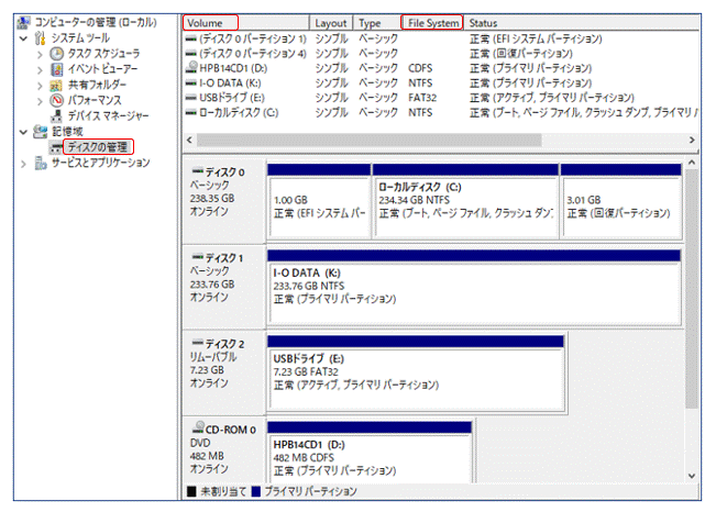 上図の上半分はOSから見て独立した記憶媒体である「Volume」を基準にして、6つのVolume に分けて表示しています。その3つ右のファイルシステム(File System)は、SSDの「ローカルディスク(C:)」と外付けHDDの「IO-DATA(K:)」が「NTFS」、USBメモリのそれは「FAT32」であることを確認しておきましょう。