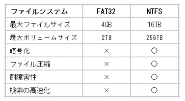 NTFS は大容量で信頼性が求められるHDDやSSDに適用され、FAT32 はUSBメモリなど小容量で簡易なディスクに使用されます。