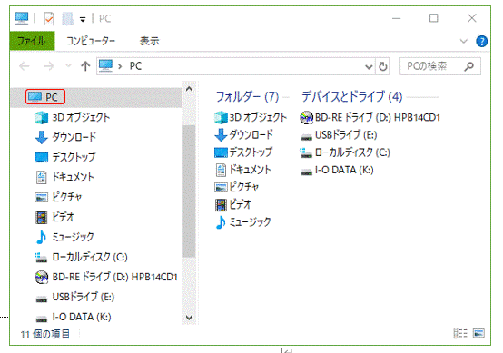 前項では「BD-REドライブ(D:)HPB14CD1」を外してボリュームラベルの話をしてきました。こんなCD/DVD/BDなどメディアの読み書きをするドライブでは、ドライブ文字「D:」の左側の「BD-REドライブ」と、右側の「HPB14CD1」の文字列がボリュームラベルになります。
