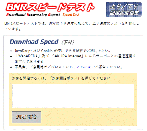 (参考2)ルータ中継器 通信速度を実測する無料のWebサービスもあります。次の「BNRスピードテスト」はその一例です。是非、自PCの通信速度の計測して上記のような速度が出ているか確認してください。「測定開始」ボタンを押すだけで結果が表示されます。