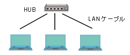 いきなり LANとは? の説明をしてもピンときませんので、下図に簡単なLANのハード構成の例を示します。これはPCのLAN端子とHUB(ハブ)を、LANケーブルで接続しただけですが、こんなハード構成とその規格を