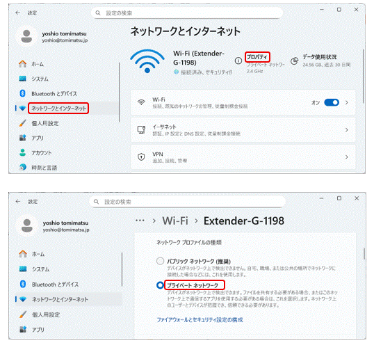 設定の手順は下図上のように「ネットワークとインターネット」の右欄で、「プロパティ」を選択 ~ 下図下が出るので「ネットワークプロファイルの種類」で「プライベートネットワーク」を選択します。これでLANに接続されたPC同士が互いに認識できるようになります。