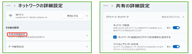 引き続き「ネットワークとインターネット」の右欄で、下方の「ネットワークの詳細設定」を選択 ~ 下図左の「ネットワークの詳細設定」で「共有の詳細設定」を選択