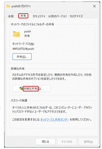 ~「プロパティ」から、右図「yoshi のプロパティ」を開いて、さらに「共有」タブを開きます。